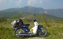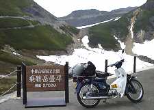 塩尻で給油。塩尻からは、『サラダ街道』を波田まで。この道は、農耕地の中を走る道で、交通量も少なく広々として気持ちが良い。気温も上がり、睡魔が襲う。 平湯からは、標高2700mまで、ひたすら登りである。オーバーヒートしないように、低いギアでは、あまり回転を上げないようにする。気温も徐々に下がって行く。エゾハルゼミが鳴いている。初夏だなぁ。料金所で通行料を払う。長野側へは抜けれないので、必ず往復料金になる。往復300円。 ![]() 10:13乗鞍畳平着。走行288km。標高2702m。登りの途中で、メーターは68000kmを回った。なんて、タフなんだ! カブでここに来るのは2度目である。前回は、友人の50ccスクーターと松本でキャンプして、ここまで来たのだ。今回は、直接来たので、感慨深いというか浅いというか、不思議な感じだ。 今年は雪が少ない。雪渓では、スキーをしている。残念ながら、バイクは数台しかいない。いずれもビックバイクで、ライダーは見あたらない。カブで日帰りで来たといえば、大ウケ間違いないのだけれど…。 観光客が多く散策する気にならなかったので、五平餅など食べながら、山を眺める。 ![]() 下りはのんびり写真などを撮りながら行く。下りながら、「安房峠を登り返すの嫌だなー。その先の工事渋滞は相当長くなっているだろうし…」などと考える。「たしか、高山方面へ少し行くと、木曽福島へ行く国道があったはずだ。以前、通ったことがあるぞ。白骨温泉はパスして、そっちに行こう!」と、気分で決める。乗鞍から西側は手持ちの地図(旧2輪車ツーリングマップ関東)に載っていないが、行ってしまえ。R158は空いていて、気持ちの良い道。信号もほとんどない。しかし、かなり距離を走っても、分岐する国道は現れない。家からどんどん遠ざかっているけど、いいのか?